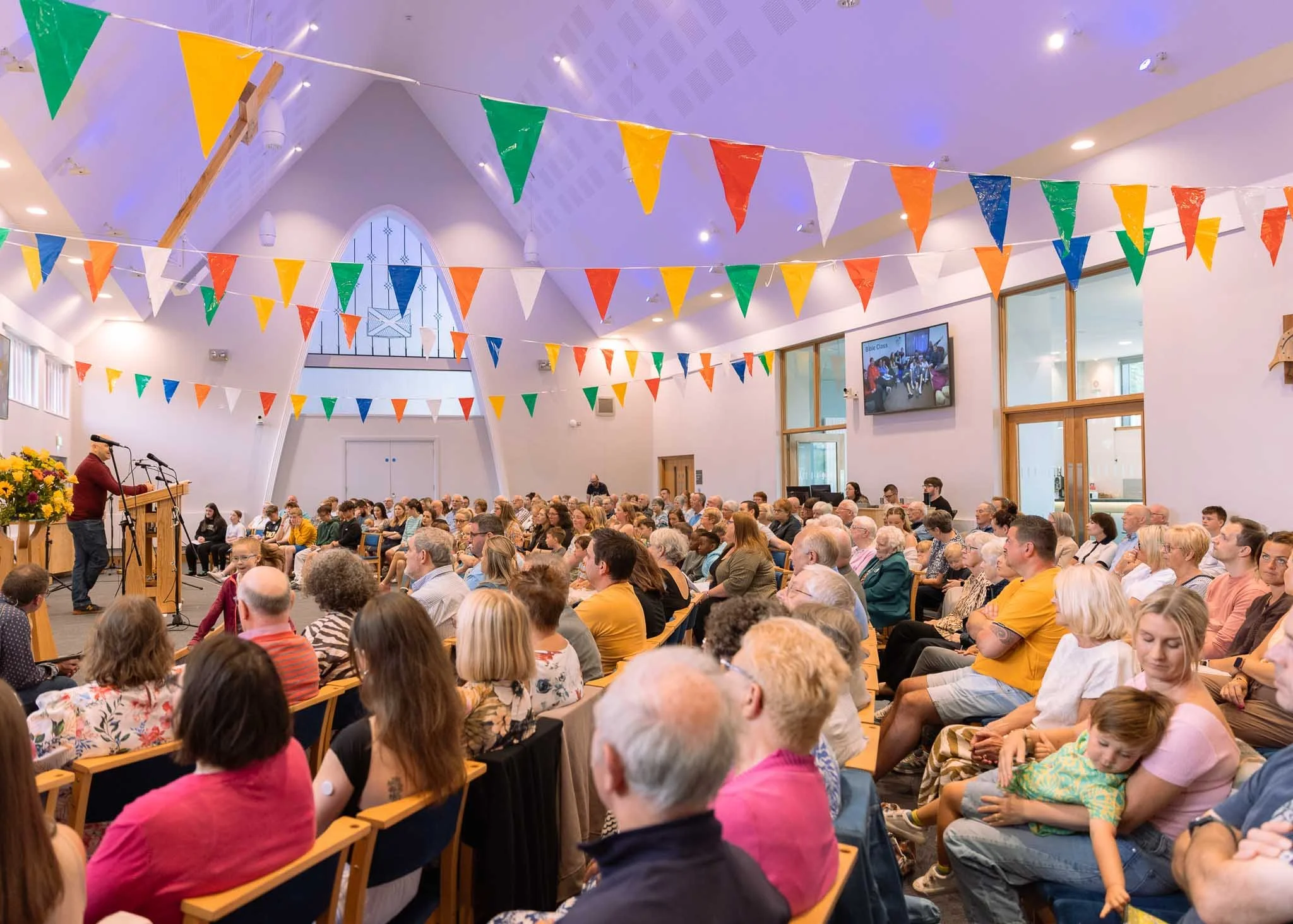 We are guided through our worship gatherings by our minister, so there’s no need to worry about what’s coming next. We normally stand up to sing, but if you’re not able to, you’re welcome to stay seated. The words for the songs are displayed on large screens for all to see. The Bible passages we read are also on the screens but we have Bibles available in the Welcome Centre if you’d like to make use of one. Each worship gathering lasts for about 75 minutes.